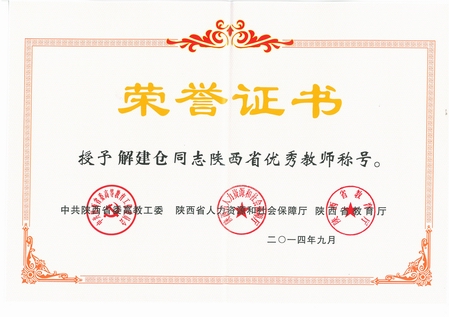 中心解建仓教授被授予“陕西省优秀教师”称号。解老师长期坚守教育教学一线,切实履行教师岗位职责和义务,并重视学生的人格培养、科研指导和规范化管理,坚持定期组织研讨会,在培养人才等方面成绩突出;在科研上,解老师兢兢业业地致力于学术研究,主持或参与多项国家“863”计划、国家自然科学基金、重大纵横向研究课题等项目,取得的创造性成果具有重要的科学价值和良好的社会效益,多次获得省部级科学技术奖励。
