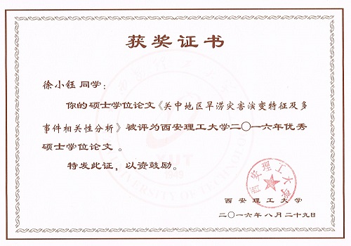 2016年西安理工大学硕士学位论文评选工作现已结束,经过专家评审,中心硕士毕业生论文《关中地区旱涝灾害演特征及多事件相关性分析》被评为西安理工大学2016年优秀硕士学位论文。