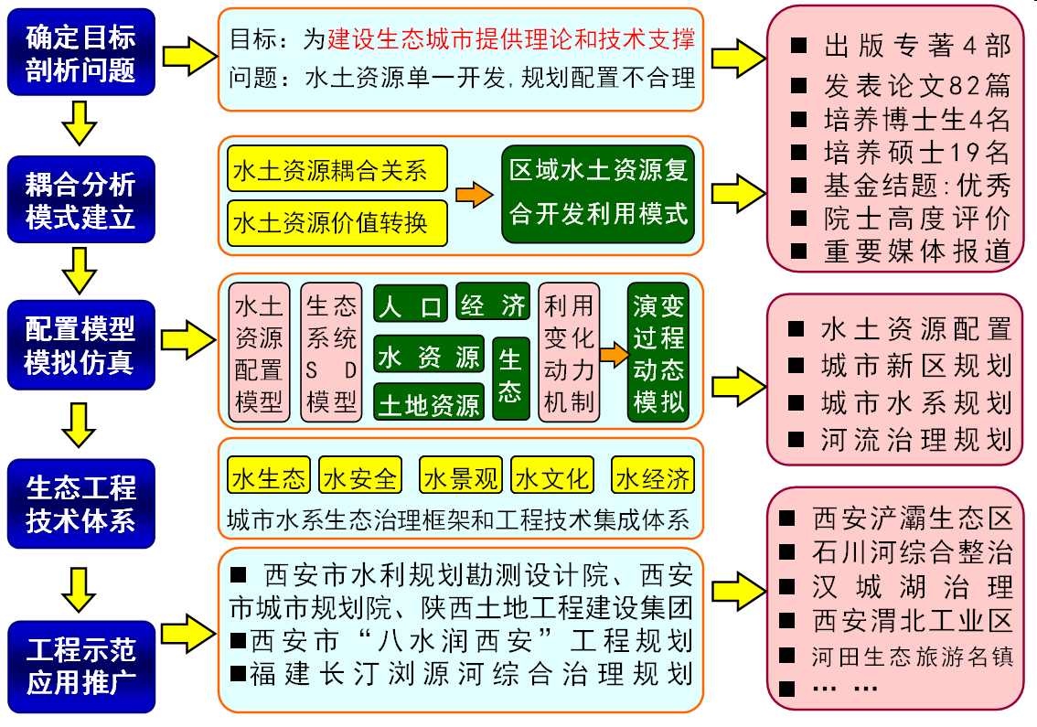 生态城市建设是人类文明进步的标志,是城市发展的方向。水土资源作为城市生态与经济系统中基础性、战略性的因素,随着城市化进程的不断推进,需求急剧增加、利用矛盾突出,严重制约城市的健康持续发展。针对这些问题,智库依托西北旱区生态水利国家重点实验室,国家自然基金、陕西省自然基金、西安市水务局科技项目及工程规划设计项目,在多年从事城市水土资源利用和城市河流治理研究和实践的基础上,研究构建了城市水土资源复合开发利用模式及优化配置模型,定量分析其综合效应和驱动因子,提出复合开发利用模式的实施机制,建立城市河流生态治理框架和工程技术集成体系,并开展工程示范和应用推广,生态效益、社会效益与经济效益突出。