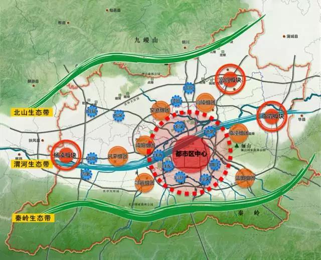 “多中心”:在都市区外围形成阎富板块、兴平板块、杨凌板块等,以主导产业为引领,分别在各自核心区形成中心,构建大西安多中心空间结构。
