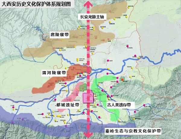 五带:古人类遗存带、都城遗址带、渭河陵寝带、唐陵寝带、秦岭生态与宗教文化保护带。