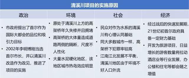 清溪川经历了六百多年的沉浮,而清溪川改造项目能够顺利实施也是积蓄了各方面的力量。下图从政治、环境、社会和经济角度分析了清溪川改造项目开展的推动因素。